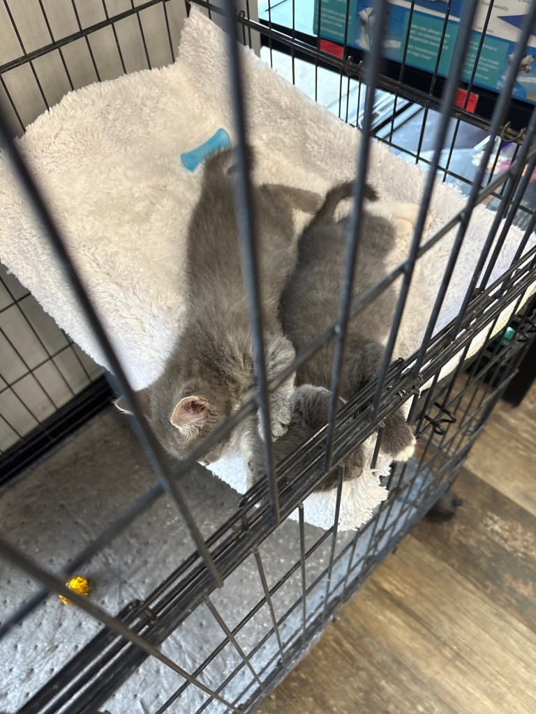 Finally, we decided to just go for it. We knew that the kittens would be at PetSupermarket in Hickory, so we headed to the store as soon as they opened. We watched a few customers ooh and ahh over the kittens. The girls finally passed out together, while their brother curled up with the other little male kitten. We met a woman that was enamored with the other male kitten, and she seemed like she might be adopting both boys, so we were happy that Skip would have a home and a playmate to grow up with.