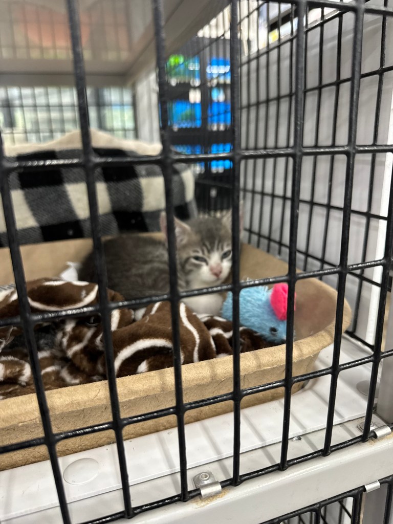 That evening we found out from the foster mom that the little male kitten had been adopted, but the lady had decided she couldn’t take two. Skip had been left in a pen with two other kittens at the store, so he’d have a chance of adoption.