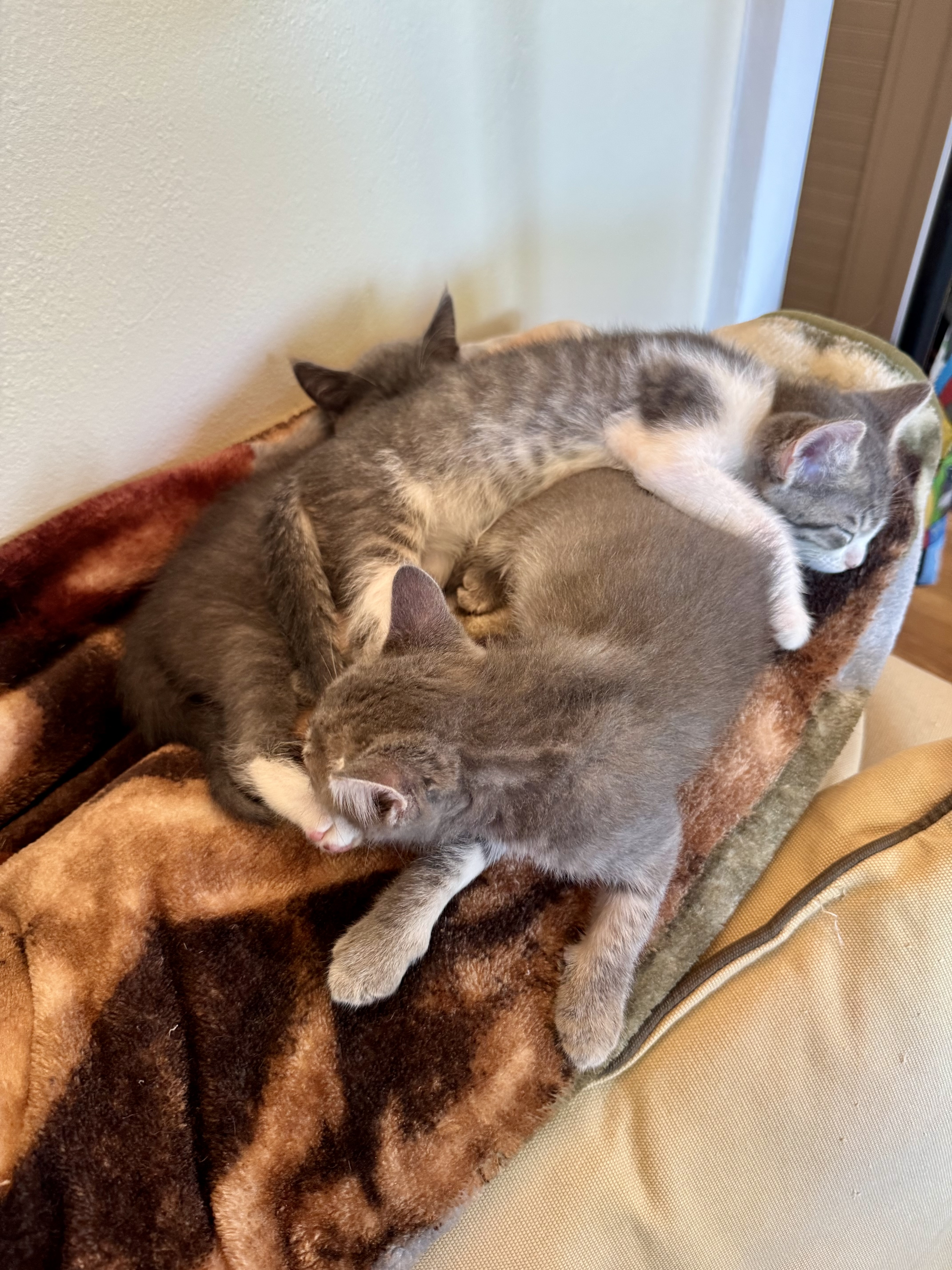 We already had an idea that we’d be adopting two. Little kittens need a playmate. Our youngest, Rosey, is three years old, and she’d grown up without another kitten companion. She spends her days with Tom and Chloe who are ten year old siblings. They are patient with her, but not always as energetic.