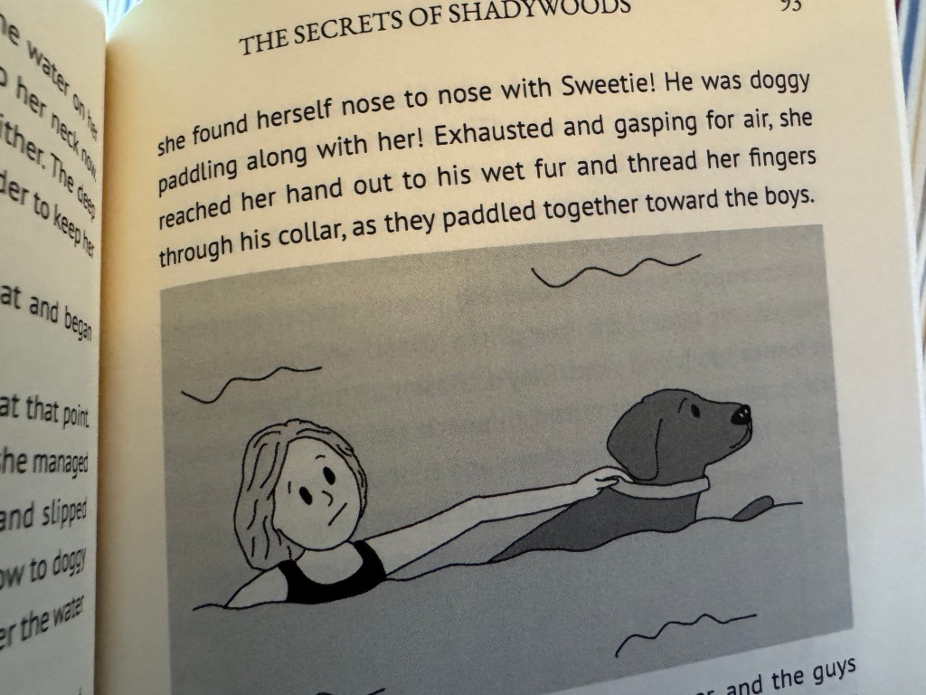 In “The Secrets of Shadywoods,” Maggie and Darlene have adventures at the campground lake. Maggie even has a scary experience where she almost drowns, but was saved by a neighbor’s dog. (Something similar happened to me!)